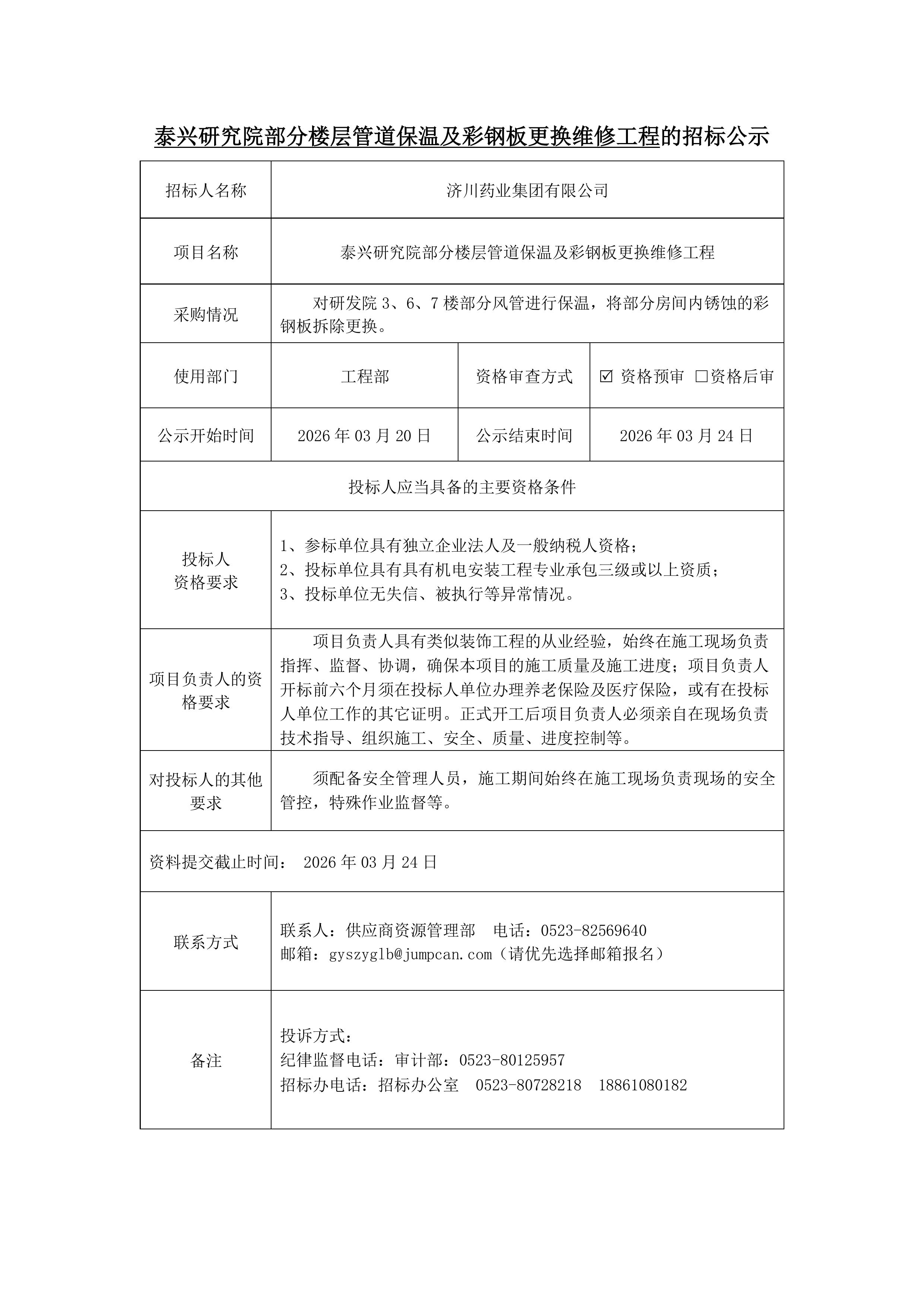 泰兴研究院部分楼层管道保温及彩钢板更换维修工程招标公示