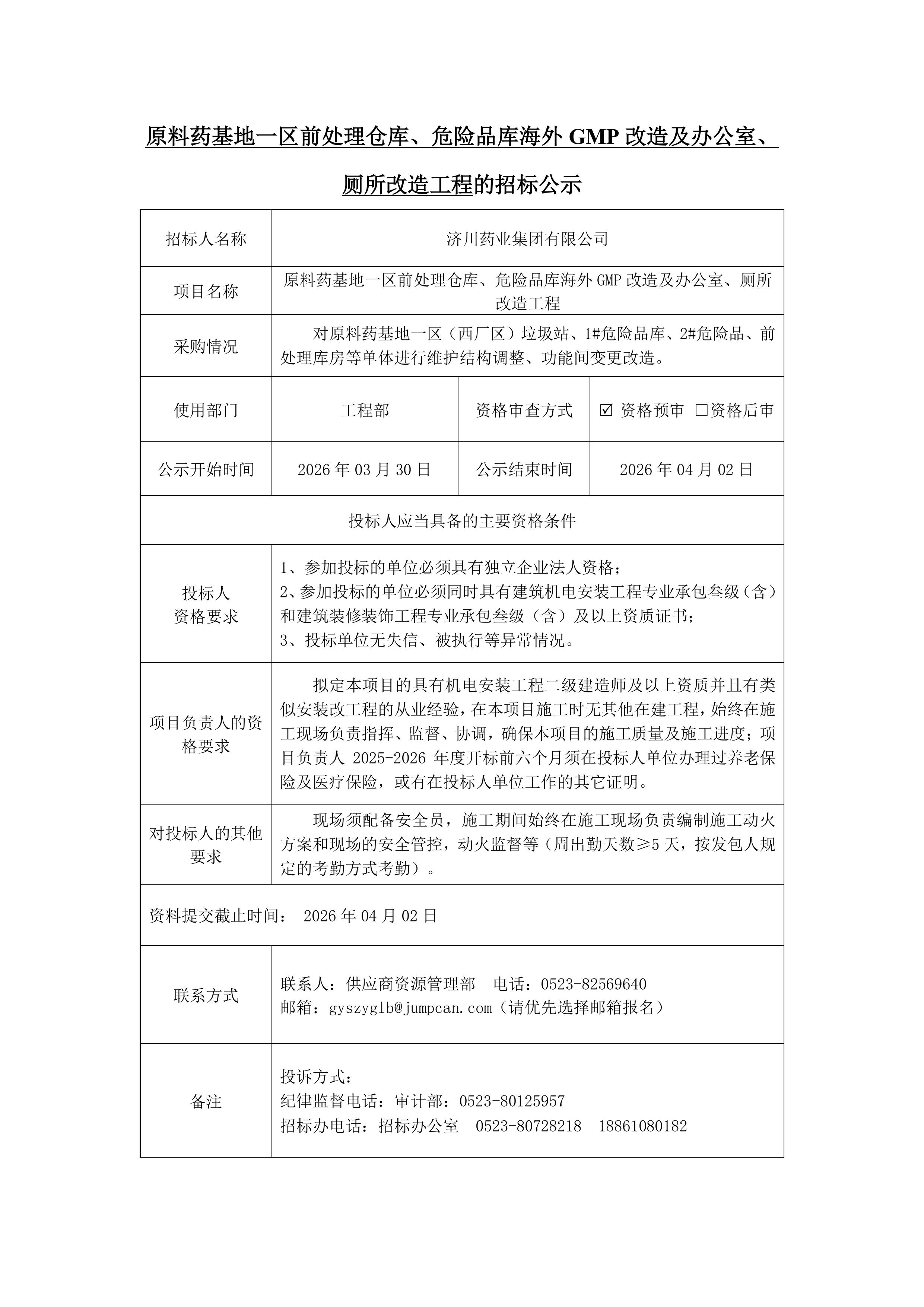 原料药基地一区前处理仓库、危险品库海外GMP改造及办公室、厕所改造工程招标公示