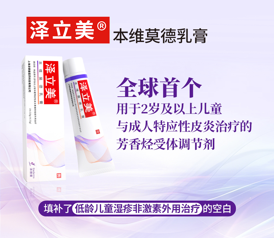 泽立美(本维莫德乳膏)是上海泽德曼医药科技有限公司自主研发的、具有全新作用机制和靶点的创新药,也是全球首个获批用于2岁及以上儿童及成人轻中度特应性皮炎治疗的芳香烃受体(AhR)调节剂。济川药业拥有泽立美(本维莫德乳膏)在中华人民共和国(不含香港、澳门特别行政区和台湾地区)的独家商业化权益。