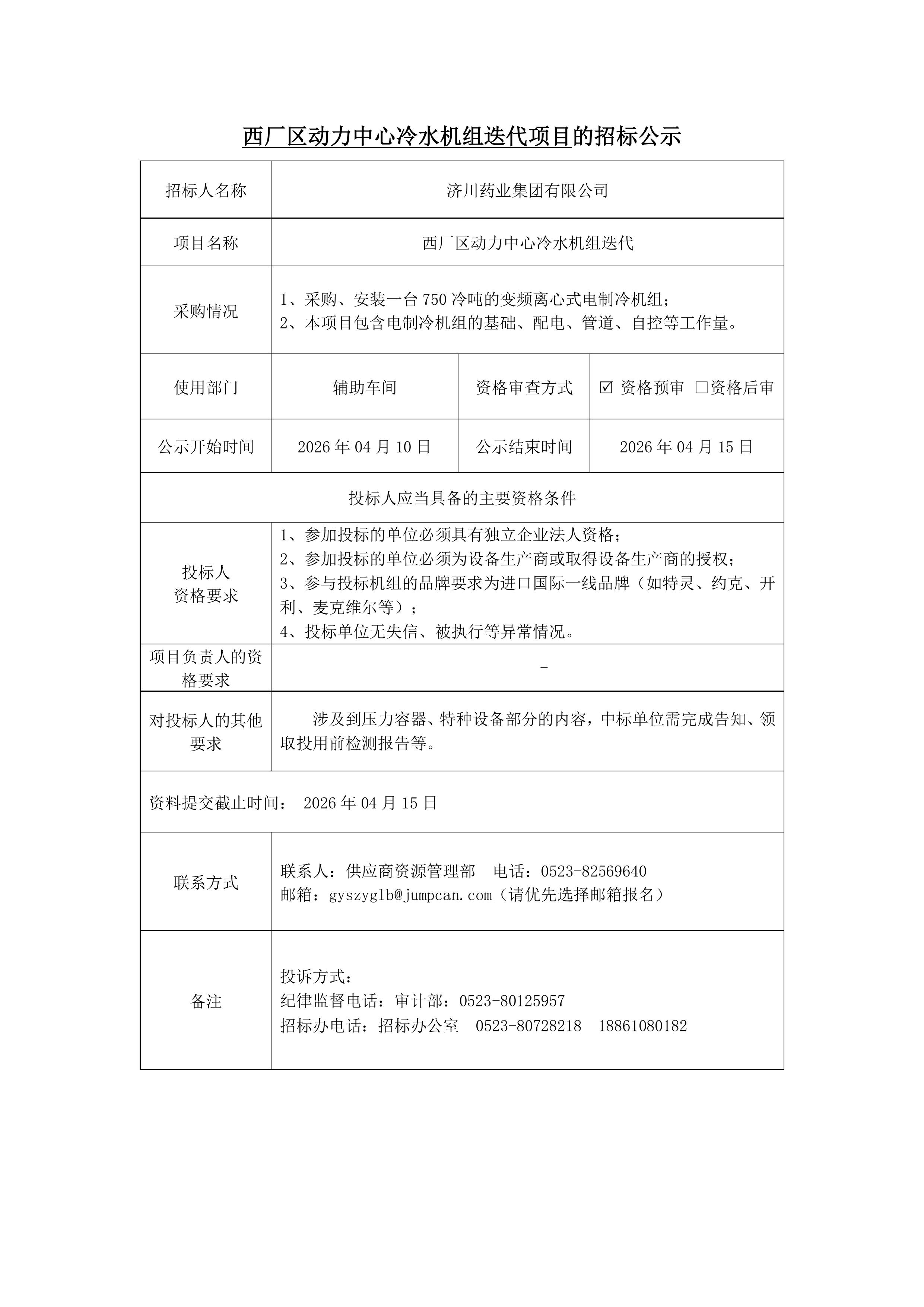 西厂区动力中心冷水机组迭代项目招标公示
