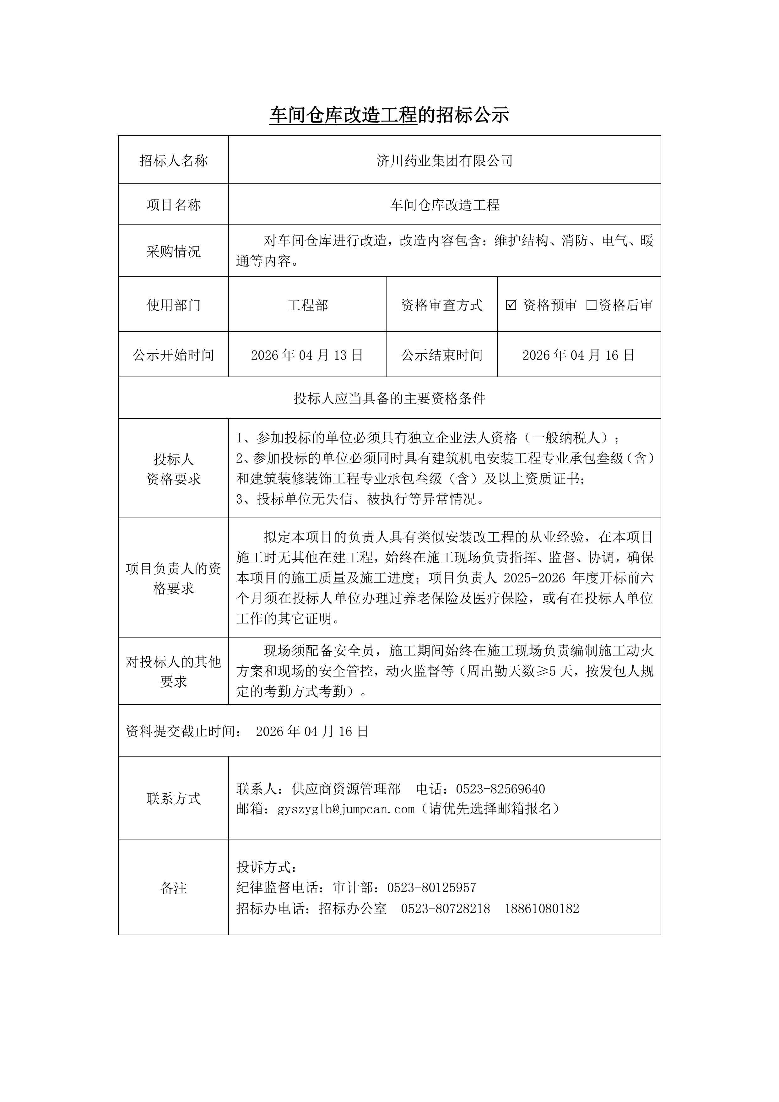 车间仓库改造工程招标公示