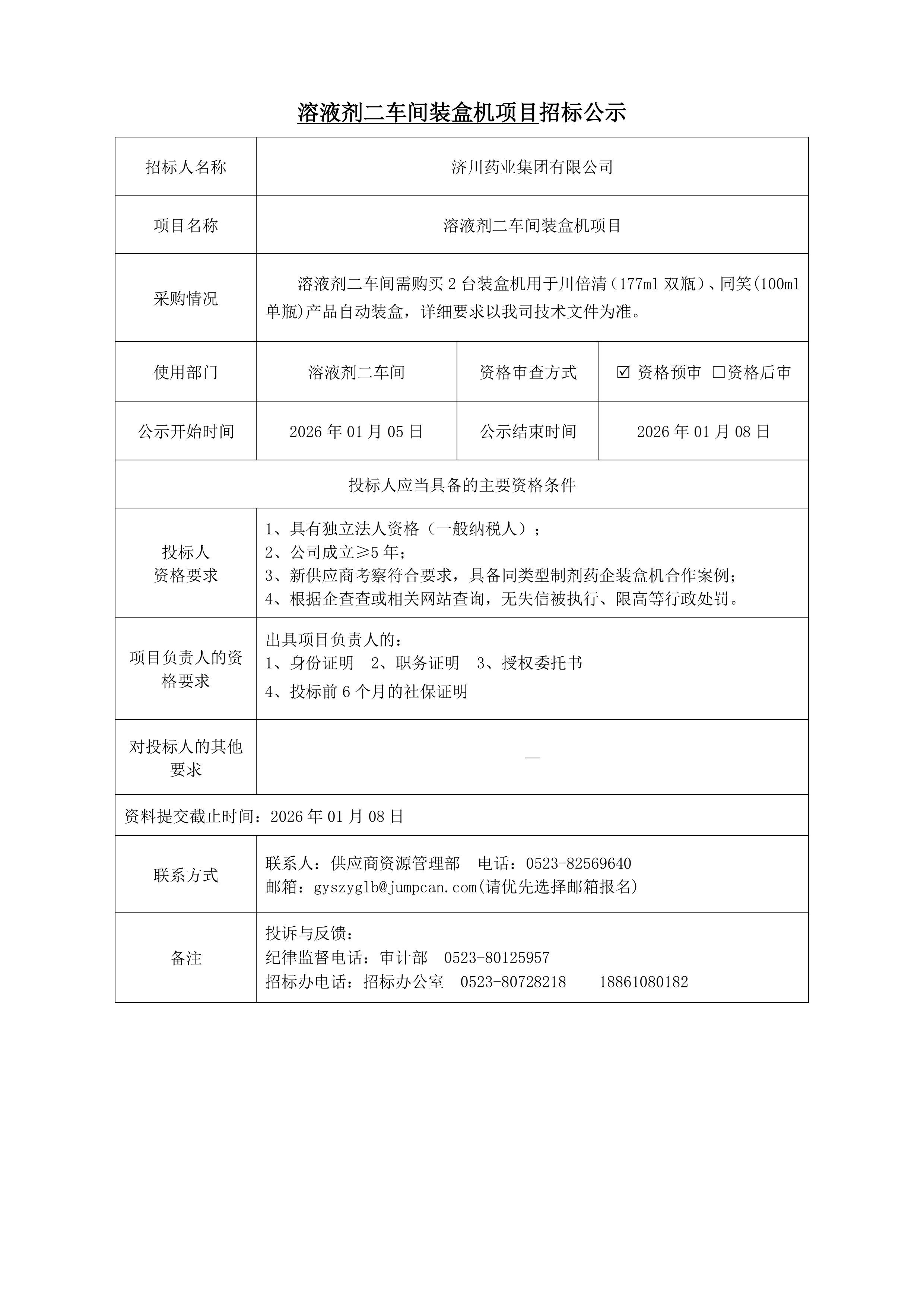 溶液剂二车间装盒机项目招标公示