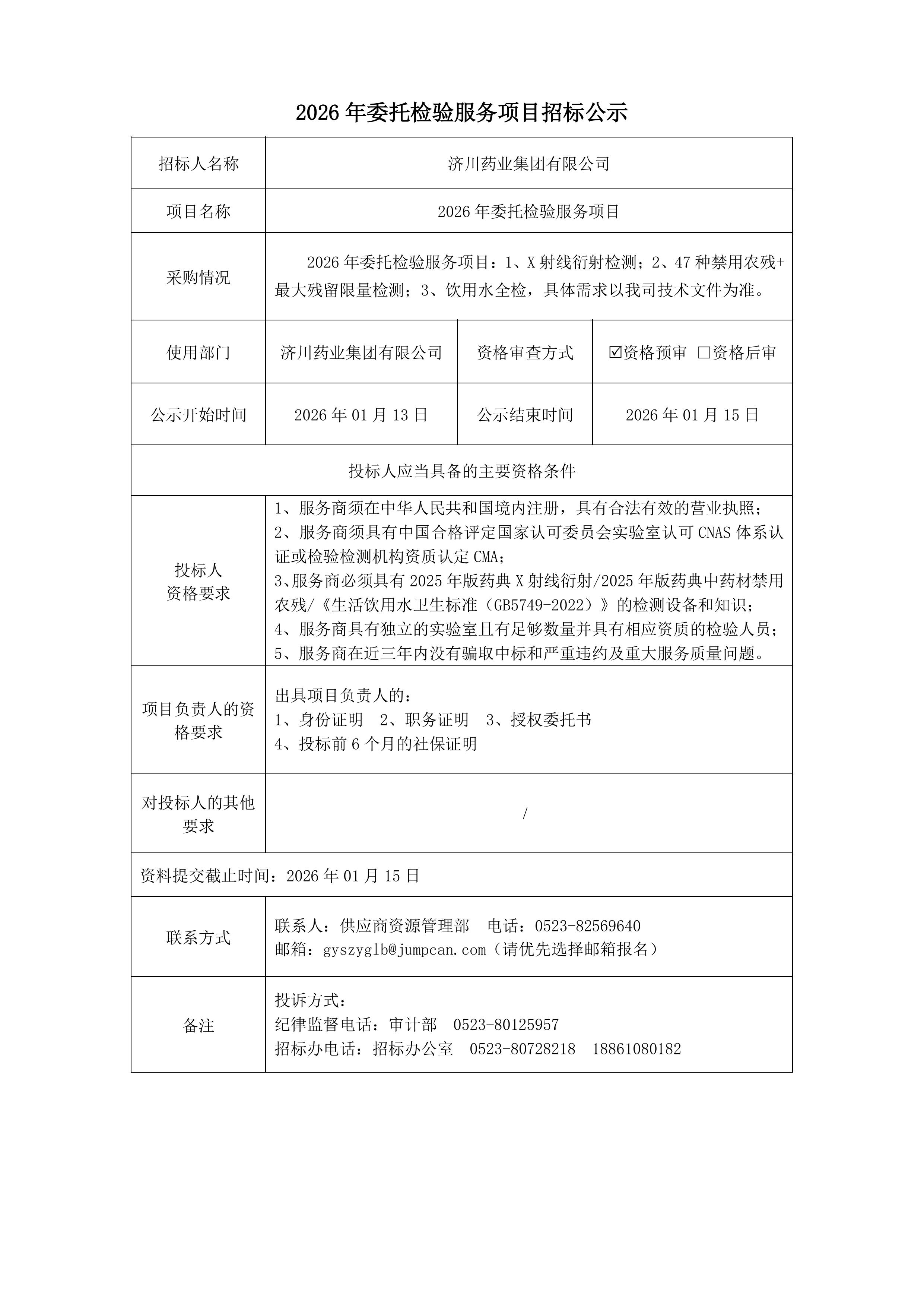 2026年委托检验服务项目招标公示